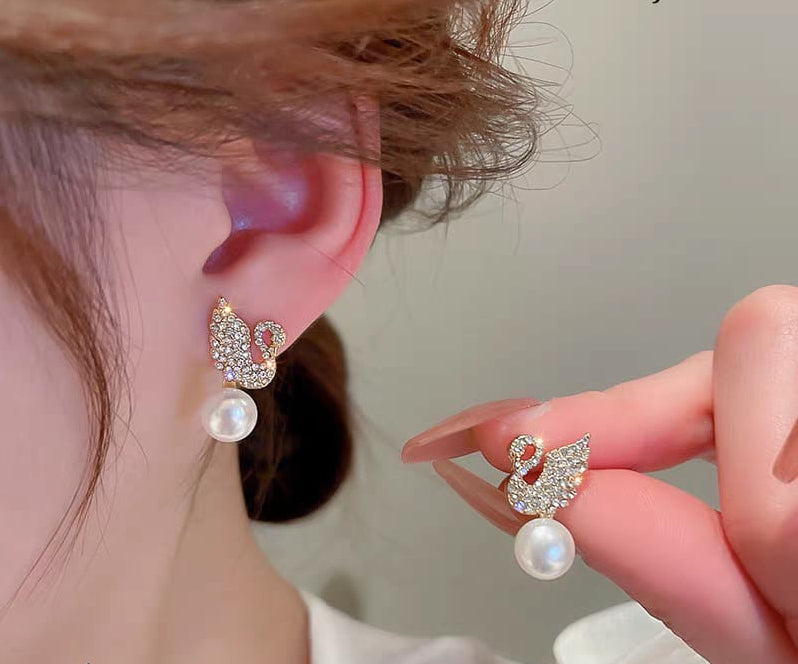 Korean Diamond Swan Pearl Earrings Fashion, Small and Versatile Stud Earrings